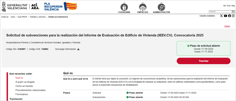 La Generalitat Valenciana, a través de la Conselleria de Servicios Sociales, Igualdad y Vivienda, ha abierto la convocatoria de ayudas para subvencionar la elaboración del Informe de Evaluación del Edificio de la Comunidad Valenciana (IEEV.CV). Esta iniciativa cuenta con una dotación inicial de 490.000 euros, con posibilidad de ampliación hasta 5 millones de euros. El plazo para la presentación de solicitudes finaliza el 17 de noviembre de 2025 o hasta agotar el crédito disponible.
