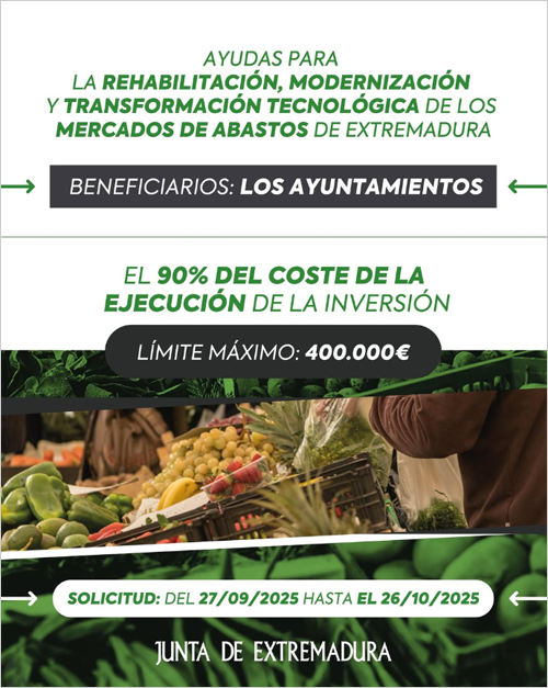 La Junta de Extremadura mantiene abierta una línea de ayudas dotada con 1.900.000 euros para la rehabilitación, modernización y transformación tecnológica de los mercados de abastos de la región. Están destinadas a ayuntamientos que cuenten con mercados de abastos en funcionamiento y permitirán financiar obras de rehabilitación, eficiencia energética, digitalización y medidas relacionadas con la economía circular. El plazo para presentar solicitudes termina el 26 de octubre de 2025.