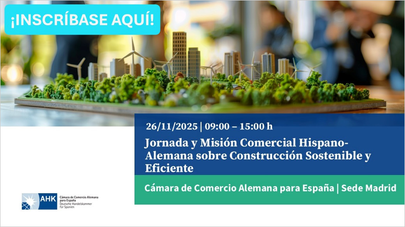 El próximo 26 de noviembre, la Cámara de Comercio Alemana para España (AHK) celebrará en su sede de Madrid la Jornada Hispano-Alemana sobre Construcción Sostenible y Eficiente. Este encuentro, con sesiones de networking, reunirá a expertos y representantes de instituciones y empresas de Alemania y España. La iniciativa, promovida por el Ministerio de Economía y Energía de Alemania (BMWi), abordará las últimas tendencias y tecnologías del sector de la construcción, presentará casos de éxito y destacará oportunidades de cooperación entre ambos países. La asistencia es gratuita, previa inscripción hasta el 25 de noviembre de 2025.