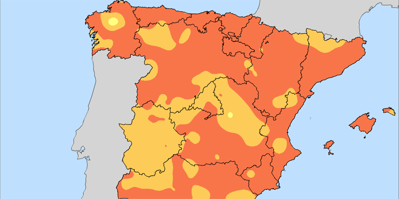 Sin embargo, la distribución espacial fue irregular. Se registró un comportamiento húmedo a muy húmedo en amplias zonas, especialmente en el oeste, el sur y parte del litoral mediterráneo. En el interior oriental y la mitad norte, las precipitaciones estuvieron cerca de lo normal, mientras que la franja cantábrica oriental y algunas áreas del norte presentaron condiciones secas o muy secas. En Canarias predominó un carácter normal a húmedo y en Baleares fue mayoritariamente normal, con pequeños núcleos secos.