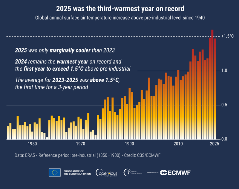 El Servicio de Cambio Climático de Copernicus de la UE (C3S) ha publicado un informe sobre el estado del clima mundial en 2025. Este año se situó apenas 0,01 °C por debajo de los niveles registrados en 2023 y, aunque 2024 sigue siendo el año más cálido jamás documentado, las temperaturas globales en 2025 se clasificaron como las terceras más altas registradas. En Europa, 2025 también fue el tercer año más caluroso registrado.