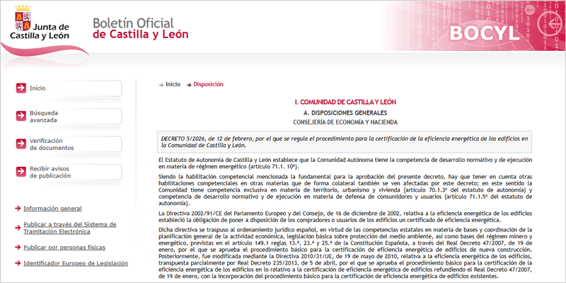 La aprobación de un nuevo Decreto por parte de la Junta de Castilla y León regula el procedimiento para la certificación energética de edificios y el registro de los certificados de eficiencia en la edificación, adaptándolos a las exigencias de la normativa estatal y europea. La norma, que deroga la anterior, ofrece a los consumidores información pública y objetiva sobre el comportamiento energético de los edificios, aumentando la transparencia en el mercado inmobiliario.
