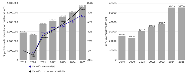 El informe destaca que la actividad del sector alcanzó un volumen de 50.461,76 millones de euros en 2023, mostrando un crecimiento sostenido año tras año. Además, se estima que el número de viviendas con visado de rehabilitación alcanzó 55.558 unidades en 2025, lo que evidencia la expansión proyectada del sector.