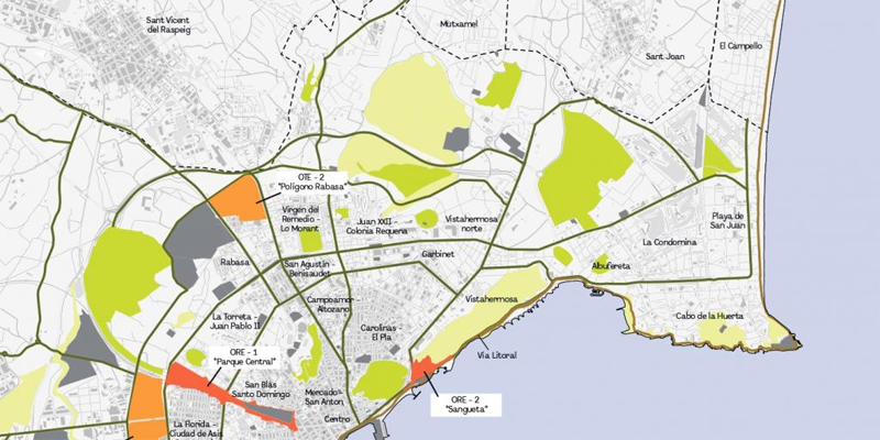 En cuanto a las ORE, el PGE identifica tres actuaciones. La primera es Parque Central, ya prevista en el planeamiento vigente, con unas 37 hectáreas más la pieza dotacional asociada a la estación de Renfe. El desarrollo contempla un parque urbano de al menos 150.000 m², la integración de la estación ferroviaria en un nodo intermodal y un potencial de 1.400 nuevas viviendas.