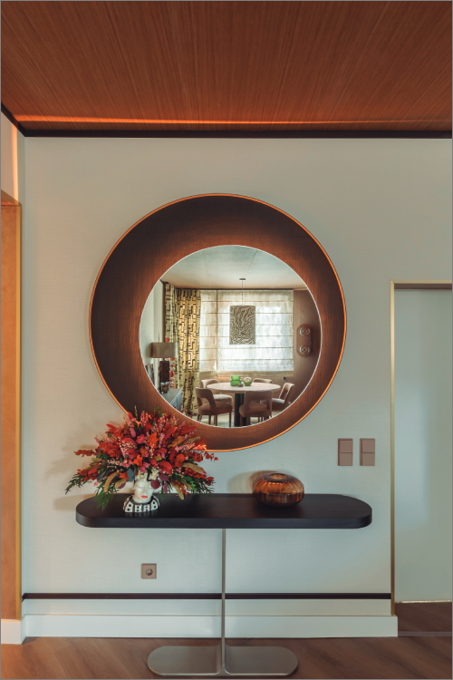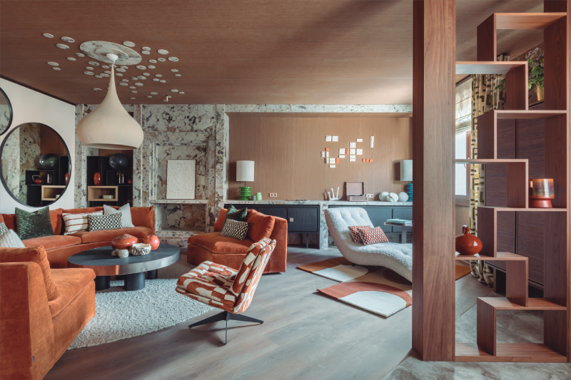 El salón comedor ‘La vie, chez nous’, de S de Studio, recupera el espíritu de los años setenta mediante una mezcla de maderas, textiles y patrones geométricos. Los mecanismos LS 990, en tonos inspirados en Le Corbusier, refuerzan la continuidad visual del diseño, adaptándose a la perfección al estilo retro y atemporal del espacio.