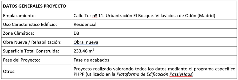 El solar se encuentra situado en la urbanización “El Bosque” de Villaviciosa de Odón (Madrid), con un entorno definido por viviendas unifamiliares aisladas o pareadas. Presenta una configuración prácticamente rectangular con una superficie en planta, según plano topográfico, de 1627,40 m2. La edificación que se plantea cumple los requisitos establecidos en el estándar Passivhaus Plus establecido según el Passive House Institute.
