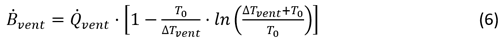 Efectuado el balance de energía, se compara la demanda total de energía Q ̇demand con las pérdidas por ventilación. Si éstas fueran menores que la demanda total, el aire de ventilación se tiene que calentar hasta la temperatura del interior del recinto Top, lo que supone una aportación mínima de exergía, que se puede calcular con la expresión: