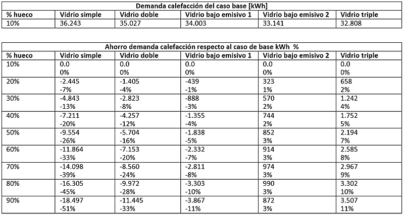 En las siguientes tablas se muestran los resultados de la demanda de calefacción para cada zona climática. Se adopta como caso base para calcular los ahorros, el porcentaje de superficie acristalada del 10%.